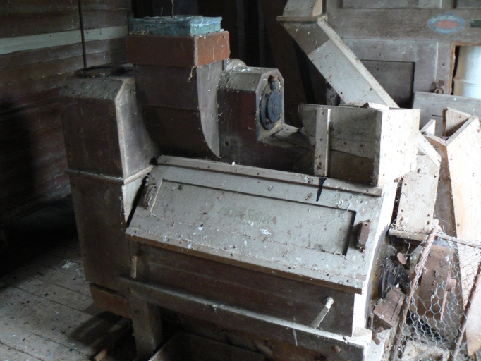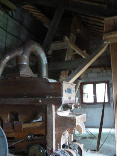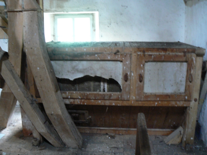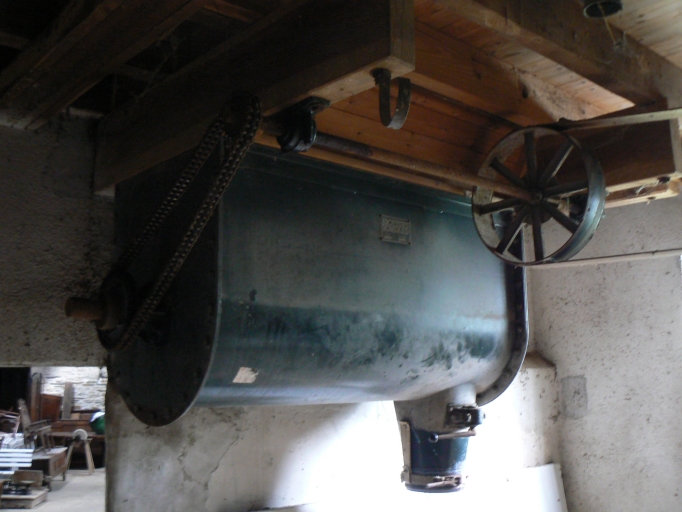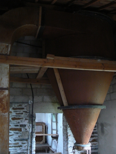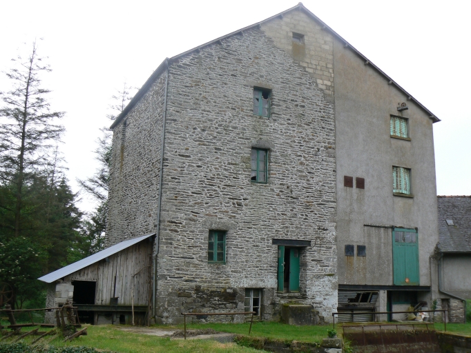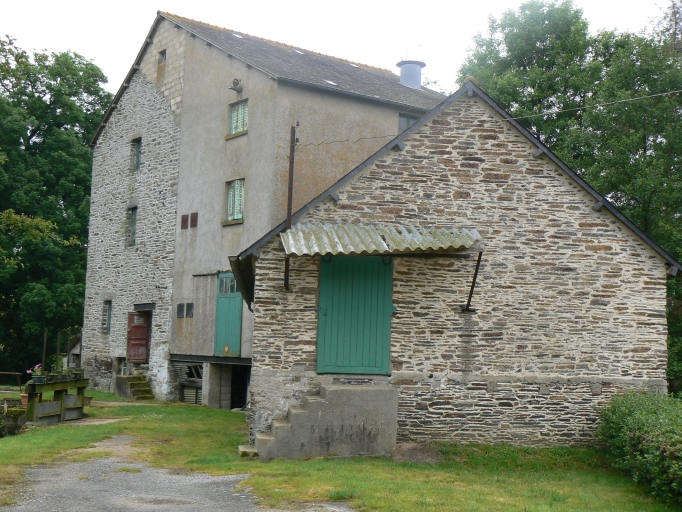 Le bâtiment de la minoterie montre une évolution complexe. Le petit moulin primitif est visible à la base du pignon. Une minoterie construite en moellon de schites et dont les encadrements sont en pierre de taille de granite, a ensuite été élevé. Elle comportait deux étages carrés. Elle a ensuite été agrandie par l'adjonction d'une partie en parpaing de béton couverte d'un enduit de ciment, qui a nécessité le réhaussement de la minoterie primitive. Cet espace composé d'un rez-de-chaussée surélevé et de deux étages carrés était destiné à l'approvisionnement et au stockage. Sa porte de grande taille coulisse latéralement. La porte de l'espace de production a un linteau constitué d'une poutrelle de fer. Contre cet ensemble un bâtiment en rez-de-chaussée surélevé au pignon en moellons de schiste et aux murs enduits de béton, est couvert en ardoise. C'était également un espace de stockage, avec une large porte coulissant latéralement, à laquelle on accède par un escalier en béton.
