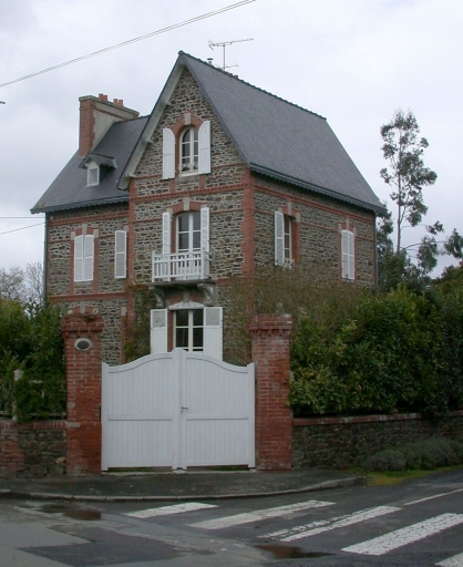 Maison à deux corps en équerre et à mur-pignon en façade antérieure construite en moellons de granite et schiste apparents. L'encadrement des baies couvertes en plate-bande avec clé de granite présente une alternance régulière de brique rouge et de granite à ton clair. Eléments de décor : brique (chaînes d'angles, baies, bandeaux), balcon, ferronnerie.