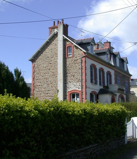 Maison mitoyenne de type ternaire construite en moellons de granite et schiste. L'entrée est abritée sous un porche flanqué à droite d'un bow-window à balcon. L'étage de comble est éclairé à l'avant par deux lucarnes-pignon à fermette débordante. Les baies de l'étage sont pourvues de gardes-corps en fer forgé. Les chaînes d'angles et les encadrements des baies sont édifiés en brique.