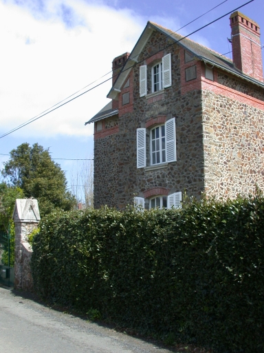 Maison construite en moellons de granite et schiste, dont l'élévation antérieure présente un mur-pignon en ressaut. Eléments de décor : brique (couvrement des baies, bandeaux, souches de cheminées).