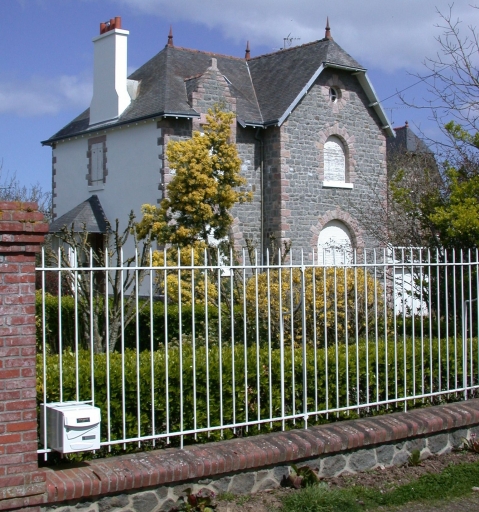Maison dont l'élévation antérieure est rythmée par deux travées. La travée de droite qui est en ressaut forme un mur-pignon percé d'un oculus et coiffé d'une demi-croupe. La travée de gauche est affirmée par une lucarne-pignon à crossettes. Le gros-oeuvre de la façade antérieure est édifié en moellons de granite équarris de couleur bleu-gris et le second-oeuvre en moellons de grès rose équarris (encadrement des baies et chaînes d'angles). La toiture est sommée de trois épis de faîtage en terre cuite. L'élévation latérale gauche reçoit l'entrée.