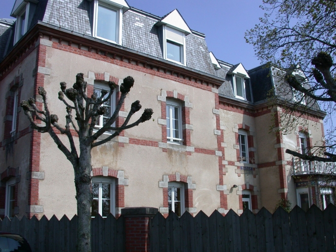 Maison à deux corps en équerre construite en moellons de granite et schiste recouverts d'un enduit. Prenant jour à l'avant, à l'arrière et sur chaque côté, elle comprend un sous-sol, un rez-de-chaussée légèrement surélevé, un étage carré et un étage de comble abrité sous un toit brisé à croupes. Orientée à l'ouest, l'élévation antérieure est rythmée par quatre travées de baies régulières. Deux travées sont en ressaut, dont celle accueillant l'entrée surmontée d'un fronton-pignon triangulaire. Orientée au sud, l'élévation latérale droite est également rythmée par quatre travées de baies et présente une travée en ressaut recevant un bow-window à balcon au rez-de-chaussée. L'encadrement des baies couvertes en plate bande avec clé de granite et les chaînes d'angles présentent une alternance régulière de brique et de granite à ton clair. Trois bandeaux de brique règnent sur chaque élévation. Une frise en céramique à décor végétal couronne le bow-window. Les fenêtres de l'élévation postérieure sont également ornées d'un bandeau de céramique à décor floral.