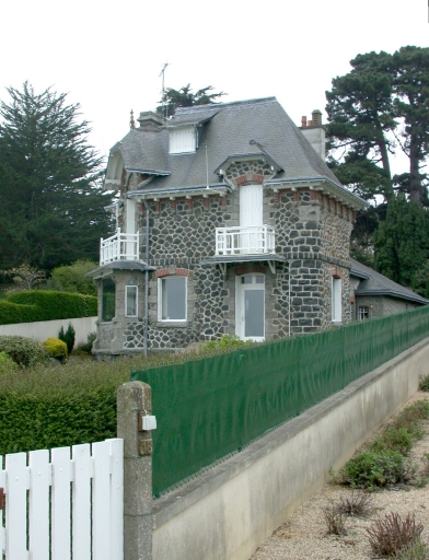 Maison construite sur un site de promontoire avec vue sur le port de Saint-Quay-Portrieux. Edifiée en moellons de granite et schiste laissés apparents, elle est composée de deux corps de bâtiment principaux disposés en équerre et d'un corps secondaire plus bas à l'arrière. L'élévation principale est édifiée en moellons de granite polygonaux. Elle présente une travée sur l'angle affirmée par un bow-window à balcon au rez-de-chaussée et par une porte-fenêtre surmontée d'un pignon interrompu par une demi-croupe débordante sommée d'un épi de faîtage en terre-cuite vernissée. Eléments de décor : bow-window à balcon, demi-croupes, balcons, brique, aisseliers, épis de faîtage, toiture débordante.