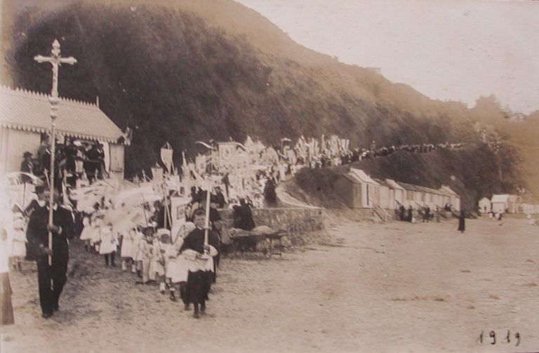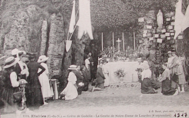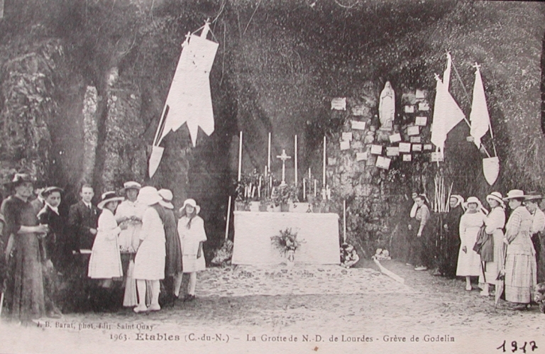 En 1878, Mme Levivier, estivante parisienne, place une statue de Notre-Dame-de-Lourdes dans une grotte des Godelins. La grotte prend l'appellation de "Grotte de Notre-Dame-de-Lourdes" en 1883 ; elle est inaugurée par Oscar Charlemagne Legris et son épouse Victoria en 1897. Cette grotte naturelle, couverte de nombreux ex-voto, accueillait un pardon annuel. La dernière cérémonie eut lieu en 1968. Aujourd'hui la grotte est abandonnée. L'érosion de la falaise par la mer et les eaux pluviales, ainsi que les éboulements de terrain ont condamné la grotte comme d'autres grottes d'Etables. La perte de ferveur religieuse a participé de la déshérence de ce lieu hautement symbolique et porteur de sens. Cependant les grottes ont participé de la renommée de la commune d'Etables, avec l'appellation donnée par un journaliste en 1909 "Etables des Grottes". Les fêtes civiles et religieuses sur la plage des Godelins ont accompagné pendant plus d'un demi siècle le développement touristique de la commune d'Etables.