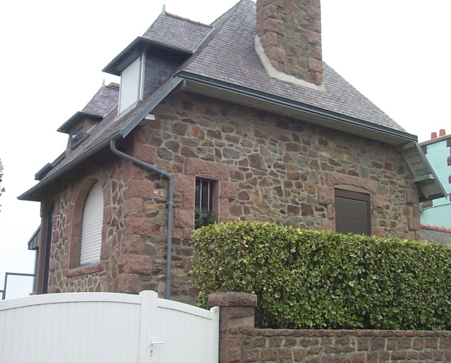 Maison dont l'élévation antérieure présente une avancée latérale. Couverte d'un toit à croupes, elle est composée d'un étage de soubassement, d'un rez-de-chaussée et d'un étage en surcroît. Le gros-oeuvre est construit en moellons de granite. L'encadrement des baies et les chaînes d'angles sont édifiés en granite rose. La porte d'entrée, située au centre de la façade antérieure, est protégée par un porche. Eléments de décor : granite rose, baies en plein-cintre.