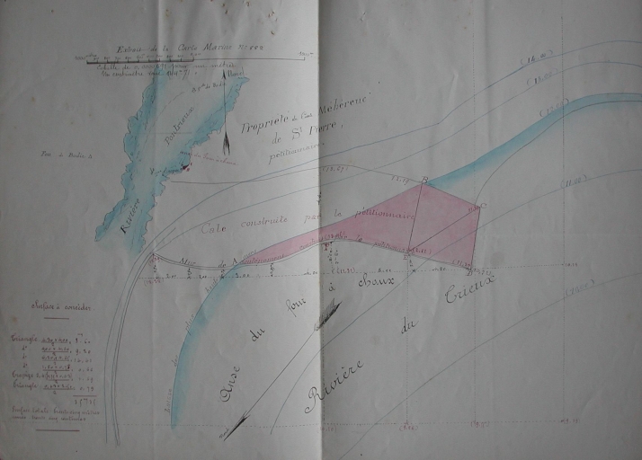 Archives départementales des Côtes-d'Armor : S Suppl. 209. Carte hydrographqique du Trieux, n° 882, annotée : Mur de soutènement et rampe d'accès dans l'anse du four à chaux, 1886.