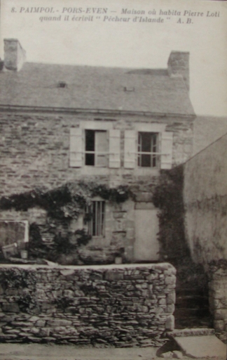 Cette ancienne maison de marin pêcheur datée du 19ème siècle fut la propriété de Guillaume Floury, qui recevait régulièrement l'écrivain Pierre Loti (Julien Viaud 1850-1923), lorsque celui-ci séjournait à Pors Even. C'est, d'après sa propre aventure amoureuse avec une jeune fille du pays de Paimpol (Pors Even), que Pierre Loti a puisé le sujet de "Pêcheur d'Islande", publié pour la 1ère fois en 1886. Ce roman connut un énorme succès et fit connaître l'épopée de la grande pêche en Islande et les nombreux naufrages dont furent victimes les marins du pays de Paimpol. La notoriété de son auteur et l'estime qui lui était portée localement, eurent pour reconnaissance, le nom de Loti porté par une goélette islandaise en 1901. Ce navire fit naufrage en mer d'Islande en 1905. C'est dans le village de Pors Even que Pierre Loti fit la connaissance de ceux qui allaient devenir les personnages de son ouvrage, en particulier Guillaume Floury, le 'Grand Yann'. La petite maison des Floury est située en bas de la côte de Pors Even, menant au port. C'est avec l'argent qu'il reçut du sauvetage d'un trois-mâts grec en 1884 que Yann Vras Floury (père de Guillaume) pu faire sur-élever sa maison d'un étage et remplacer la toiture en chaume par un toit recouvert d'ardoises.