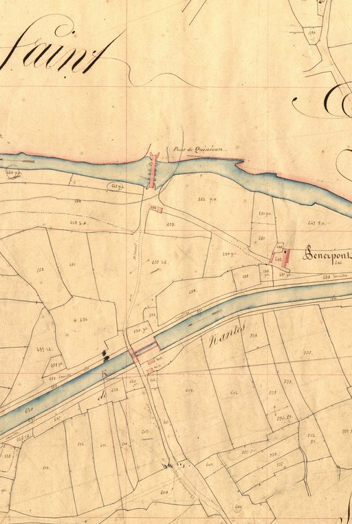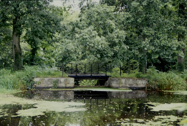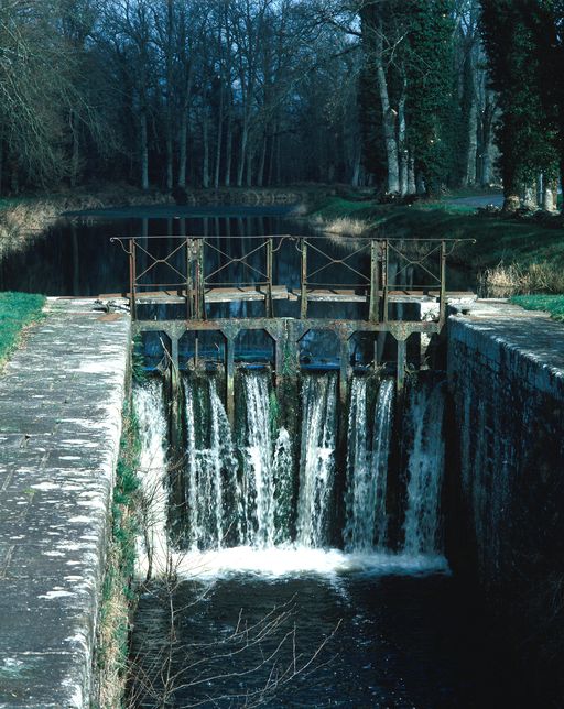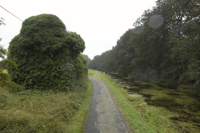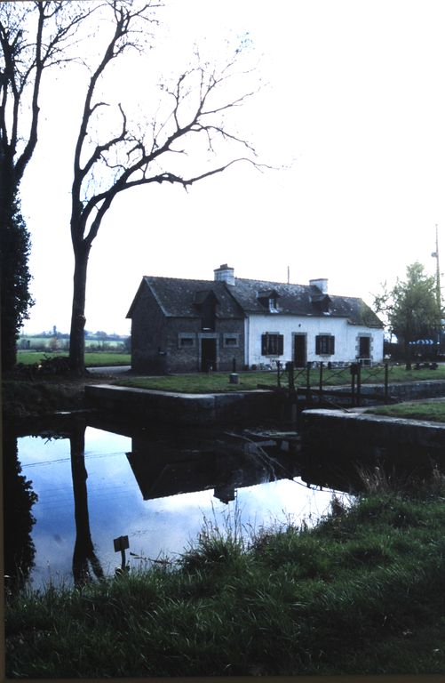 En amont : Frênes et chênes. Ruines importantes : maison. Deux dépendances latérales : rez-de-chaussée, toit à longs pans & croupe ; semble avoir été liée à l'activité du canal.