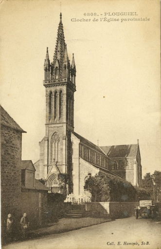 L'église paroissiale Notre-Dame de Plouguiel a été construite à partir du 25 août 1869 par l'entrepreneur Louis Kerguenou d'après les plans et devis dressés par l'architecte diocésain Alphonse Guépin. La bénédiction de la première pierre a eu lieu le 22 septembre 1869, celle de l'édifice le dimanche de la Pentecôte 1871. Sa consécration a eut lieu le 5 octobre 1873 (d'après René Couffon).