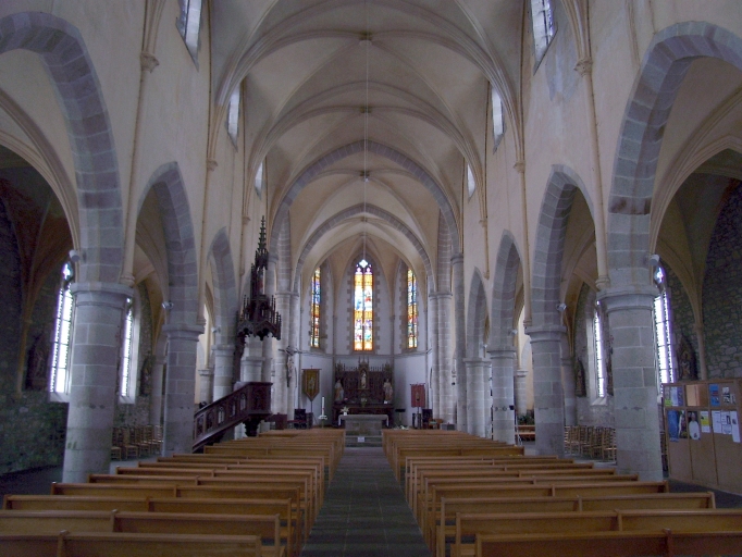 L'église paroissiale Notre-Dame de Plouguiel est une église de style néogothique à volumétrie importante et à trois vaisseaux construite en moellons de granite et schiste sur un plan en croix latine. Elle est composée de l'ouest vers l'est d'une tour-porche carrée demi-hors-oeuvre, d'une nef de six travées flanquée sur toute sa longueur de deux bas-côtés, d'un transept et d'un choeur. Le chevet à trois pans, dont une pierre à la base porte le millésime 1869, est flanqué d'un bâtiment en appentis de chaque côté. La tour est couverte d'une terrasse en encorbellement portant une flèche polygonale en maçonnerie. L'espace intérieur, dont le couvrement est formé par une voûte sur croisée d'ogives, est éclairé par des baies à remplage de pierre. Éléments de décor : pignons découverts à rampants à crossettes, pierre de taille (contreforts, encadrement des baies, chaînes d'angles, tour), trilobes, quadrilobes, baies à arc brisé, lanternons, portails sud et nord.