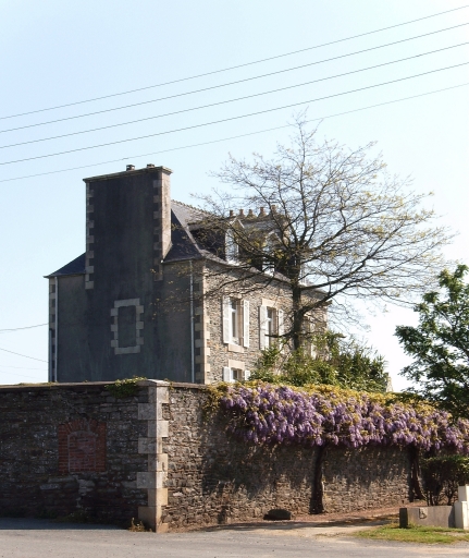 Maison de type ternaire et mur de clôture construits en moellons de granite et schiste. Elle est couverte d'un toit à croupes. L'encadrement des baies et les chaînes d'angles sont construits en pierre de taille de granite à ton clair. Éléments de décor : ferronnerie (garde-corps), granite (pierre de taille).