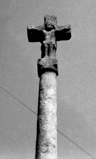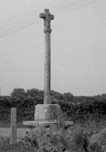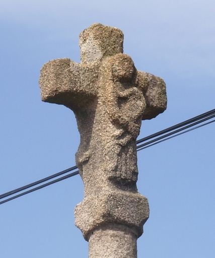 Croix de chemin en granite composée d'un soubassement, d'un socle à griffes et d'un haut fût monolithe portant une croix terminale ornée d'un Christ en croix à l'avant et d'une Vierge à l'Enfant à l'arrière.