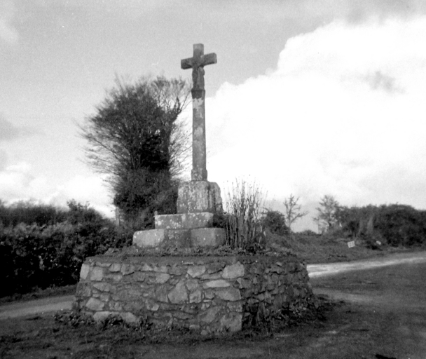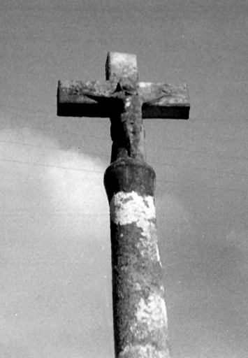 Croix de chemin composée d'un soubassement formé par une base en maçonnerie de granite portant un emmarchement à deux degrés, d'un socle et d'un fût monolithe sommé d'une croix terminale dont la face antérieure présente un Christ en croix. La face antérieure du socle porte une inscription dont la lecture s'avère incertaine.