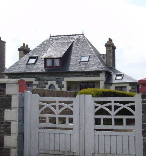 Maison de plan rectangulaire massé et à accès antérieur latéral construite en moellons de granite et schiste laissés apparents. Elle est couverte d'un toit à croupes. L'entrée est protégée par un porche dans-oeuvre. Éléments de décor : épis de faîtage, oculus.