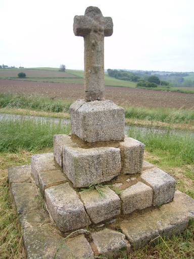 Croix de chemin en granite composée d'un soubassement formé par un emmarchement à trois degrés et d'un socle portant une croix terminale brisée ornée d'un Christ en croix à l'avant et d'une Vierge à l'Enfant à l'arrière. Le socle porte l'inscription : G : AMeLS 1838.