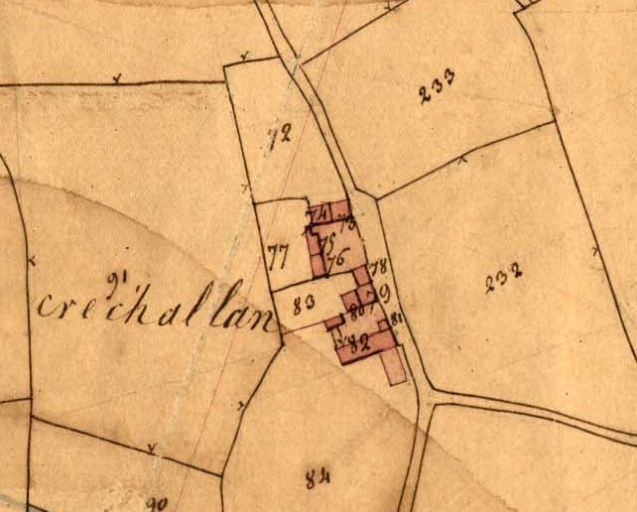 Maison de plan rectangulaire, à deux pièces identiques au rez-de-chaussée et deux portes centrales jumelées en façade, dépendance en retour d'équerre et mur de clôture édifiés en moellons de granite. Chaque pièces est éclairée en façade antérieure par une fenêtre et une petite baie latérale. Les linteaux des baies, dont un à droite présente le millésime 1813, sont délardés en segment.