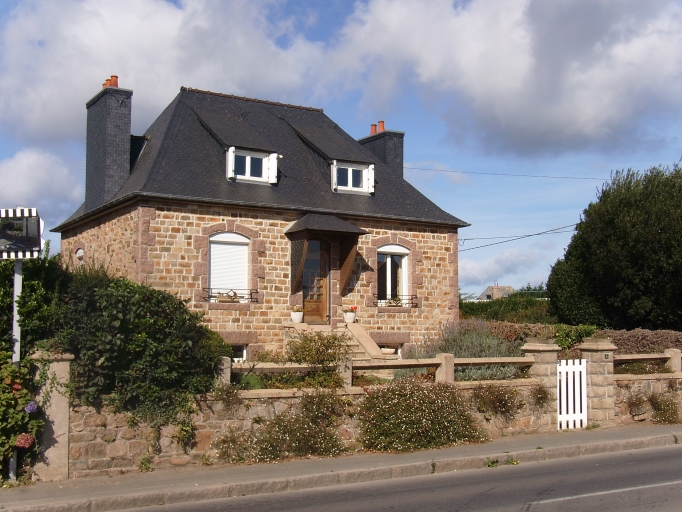 Maison de plan rectangulaire massé, à deux pièces au rez-de-chaussée et à accès antérieur central, couverte d'un toit à croupes. La façade antérieure est édifiée en moellons de granite équarris, l'encadrement des baies et les chaînes d'angles en granite rose.