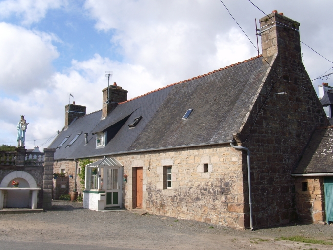 Alignement de trois logis à pièce unique au rez-de-chaussée, dont deux logis jumelés symétriques à droite, construits en moellons de granite. Les pignons présentent des rampants à crossettes.