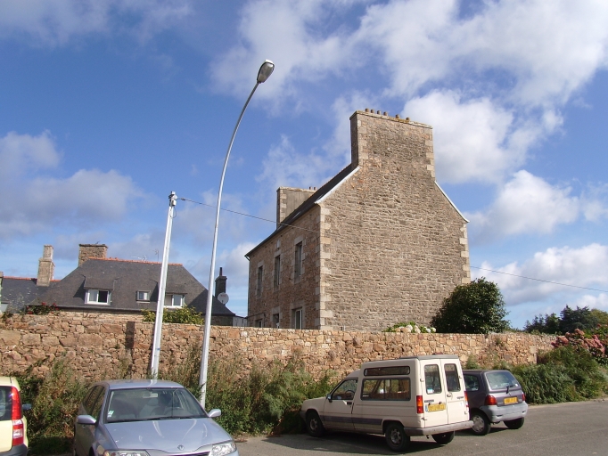 Maison de type ternaire à double orientation et haut mur de clôture chaperonné construits en moellons de granite.