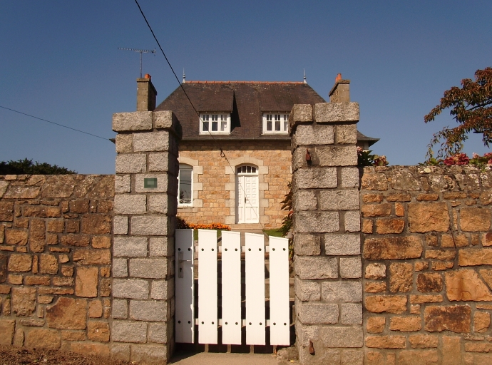 Maison de plan rectangulaire, probablement à deux pièces au rez-de-chaussée et à accès antérieur central, construite en moellons de granite. Elle est coiffée d'un toit à croupes à égout retroussé sommé de deux épis de faîtage en zinc. La façade antérieure est édifiée en moellons équarris.