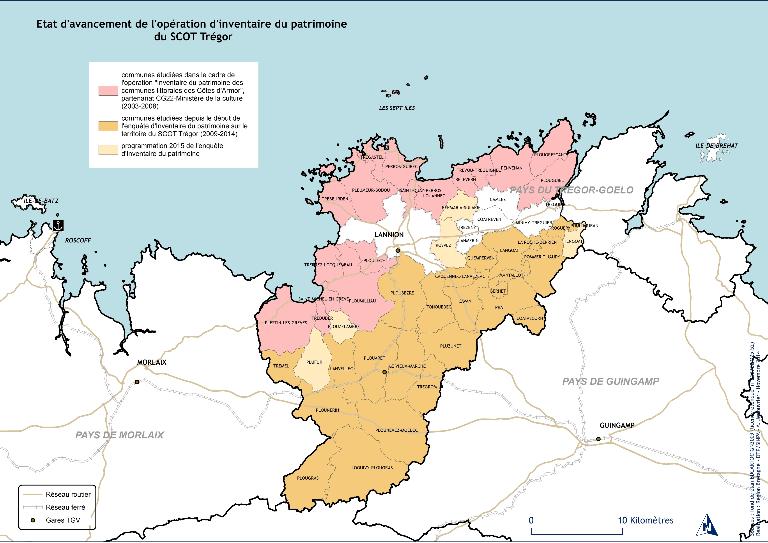 Lancé en juillet 2009 à l’échelle du territoire du Schéma de cohérence territoriale (44 communes), l’Inventaire du patrimoine piloté par la Région Bretagne s’est achevé en 2022 à l’échelle du territoire de Lannion-Trégor Communauté (60 puis 57 communes après fusion de La Roche-Jaudy en 2019). Cette aire d’étude est le territoire le plus densément couvert par des études d’Inventaire au niveau régional : 15 549 notices de recensement, 6 856 dossiers d’études et 42 570 illustrations. C’est également le territoire le plus publié dans la ligne éditoriale de la Région Bretagne : Notre-Dame-de-la-Merci de Trémel en 2018, Les grandes fermes du Trégor en 2019 et Tréguier, cité épiscopale et ville-port en 2021.