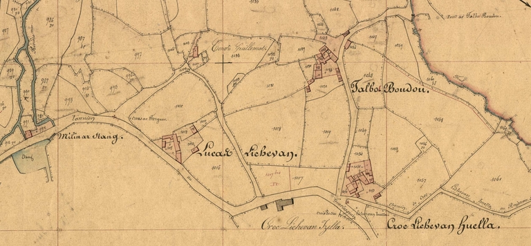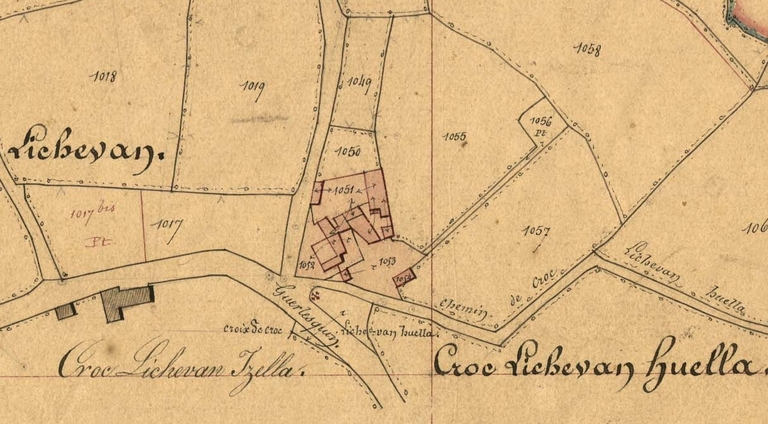 Croix de chemin, figurant sur le cadastre de 1848, associée au toponyme "Croc Lichevan Huella". Si le soubassement est datable du 18e siècle, la croix et le Christ sculpté sont datables de la 2ème moitié du 19e siècle.