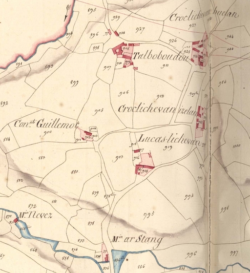 Croix en granite gris, située en bordure de la route allant de Lanvellec à Ploumilliau. Elle est composée d´un emmarchement maçonné à deux degrés intégré dans le mur d´une ferme, d´un soubassement avec table moulurée sur lequel repose un socle cubique biseauté dans la partie inférieure surmonté d´un long fût de section circulaire à écots sommé d´une croix ornée d´un Christ en croix, sculpté en haut-relief.