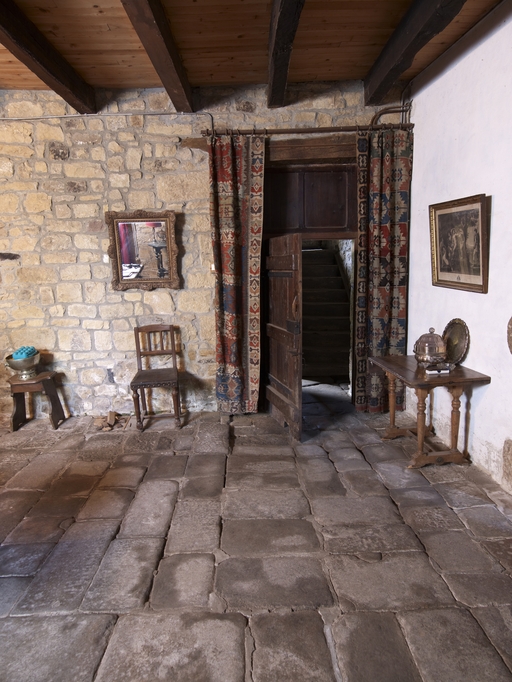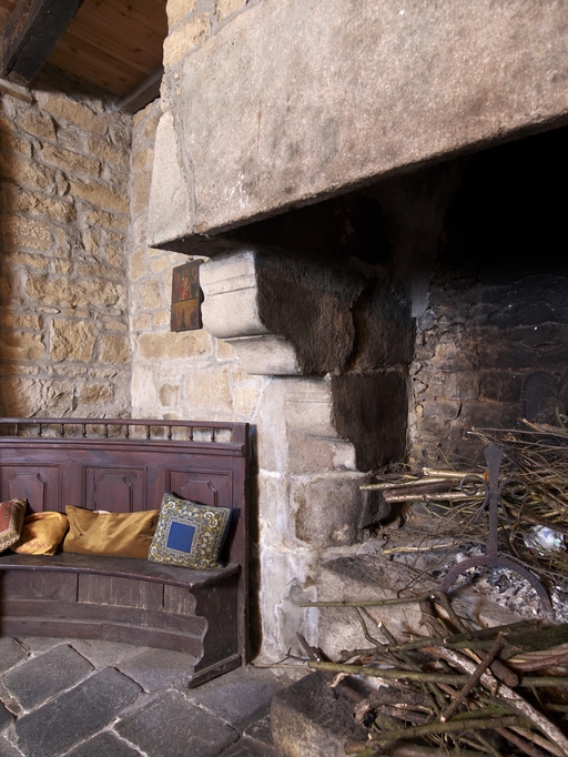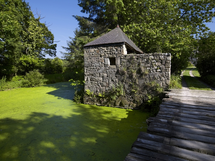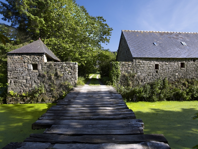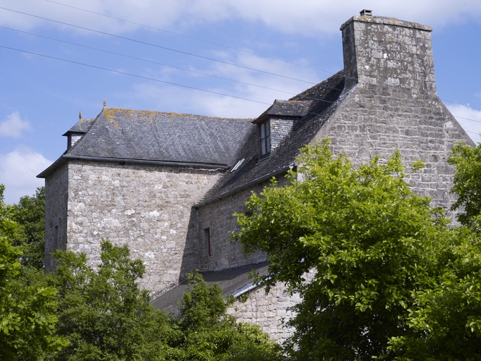 Logis et dépendances environnés de douves sur leurs côtés est, nord et ouest. Passerelle en bois sur piliers en maçonnerie permettant de traverser la douve au nord. Logis de plan allongé, à étage et élévation ordonnancée à cinq travées, construit en petits et moyens appareils de granite. Tour d'escalier rectangulaire en façade postérieure, avec pièce haute à son sommet. Appentis postérieur en rez-de-chaussée, de part et d'autre de la tour, à usage probable de cellier. Logis secondaire de type élémentaire édifié en alignement à l'est, peut-être destiné aux domestiques. Au nord, en bordure de la douve, alignement de dépendances construites en moellon.
