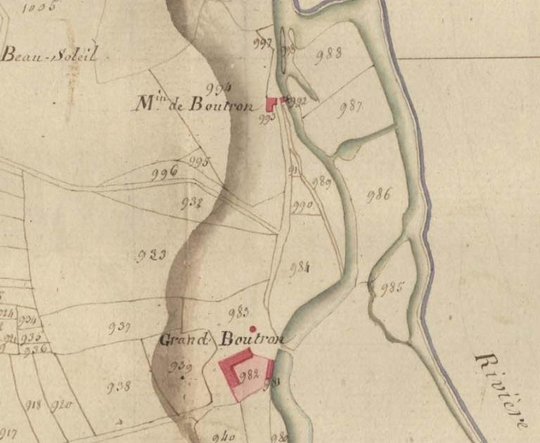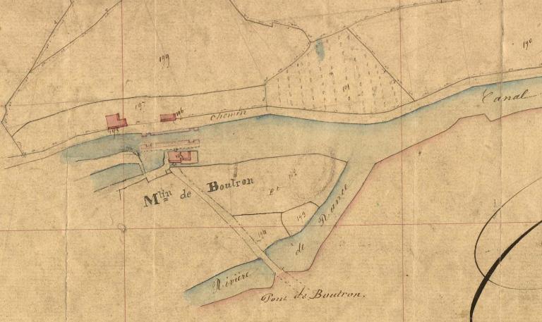 Le manoir de Boutron, dont les murs donnaient anciennement sur la rivière de Rance, est mentionné en ce lieu en 1409 comme étant la propriété de la famille Ferron, Le cadastre de 1810 présente à cet endroit un ancien passage de la Rance, qui sera maintenu lors de la construction du canal et doublé d’une cale d’embarcation visible sous le pont piétonnier métallique de la fin du 19e siècle.Le moulin situé plus en aval faisait partie du domaine seigneurial. Il a été reconstruit au 2ème quart du 19e siècle, suite à la canalisation de la Rance. Installé sur la rive gauche de la rivière sur le cadastre de 1810, il est reconstruit vers 1830 1840 sur la rive droite. De cette période date également la maison éclusière et le logement du meunier. Le moulin a été transformé en habitation lors du démontage des machines au début de la seconde guerre mondiale.