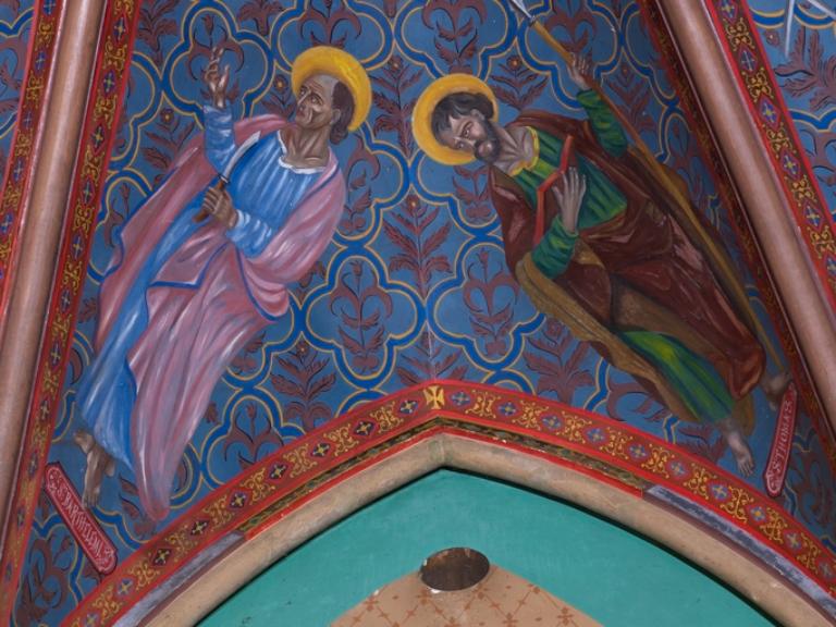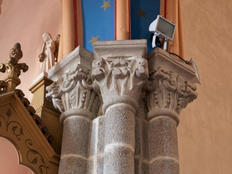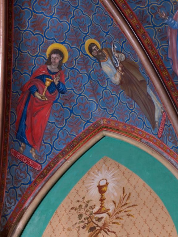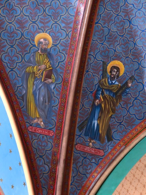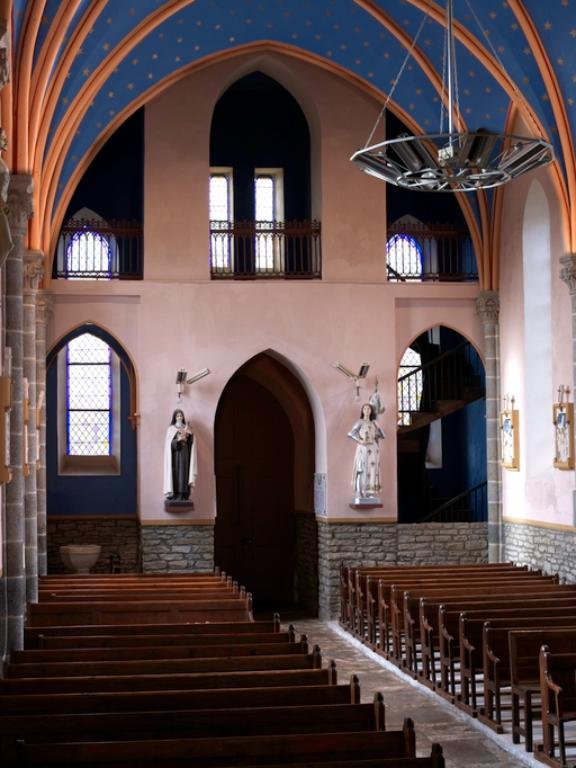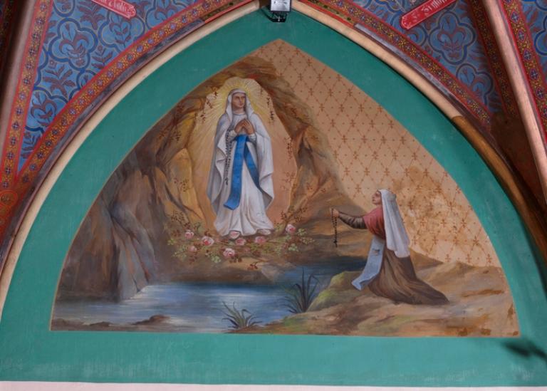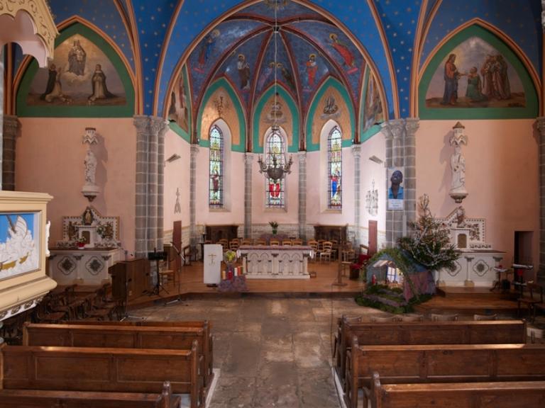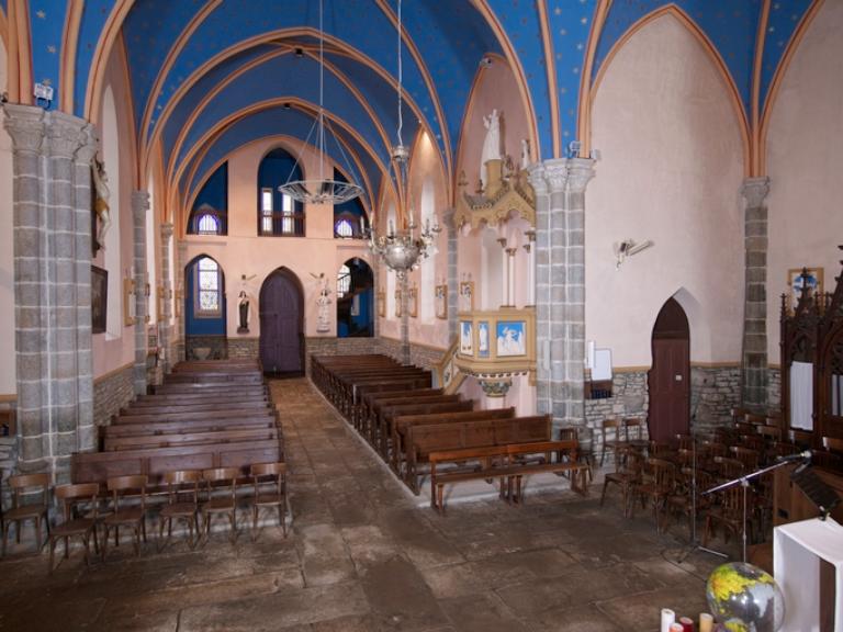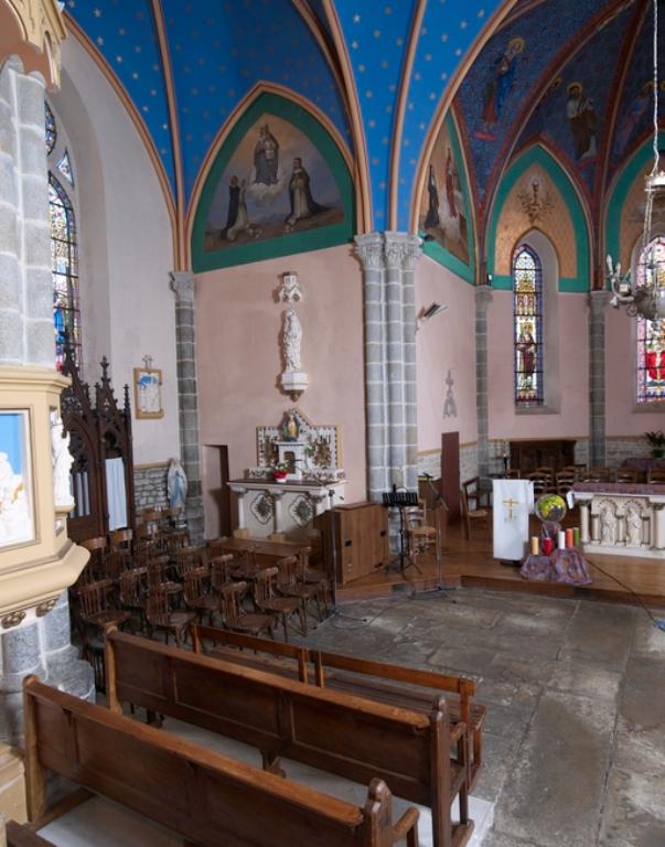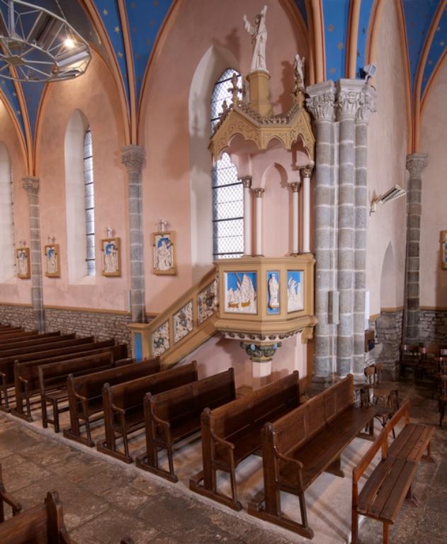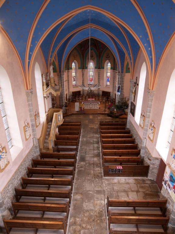 En 1826 et en 1835 on procéda à une autre reconstruction partielle. Les fenêtres, au midi, qui étaient sans doute d’étroites meurtrières, furent agrandies pour donner de la lumière. L’autel majeur avec son retable était ce qu’il y avait de plus remarquable dans le mobilier. Deux autels secondaires, l’un consacré à la sainte Vierge l’autre à saint Pierre, s’acotaient aux murs sous l’arcade étayant le clocher. Entre le chœur et l’autel de saint Pierre, côté midi, une pote avait été percée, en 1835. Plus bas, en dessous de la chaire, existait une seconde entrée. La porte principale s’ouvrait dans le pignon ouest. >>