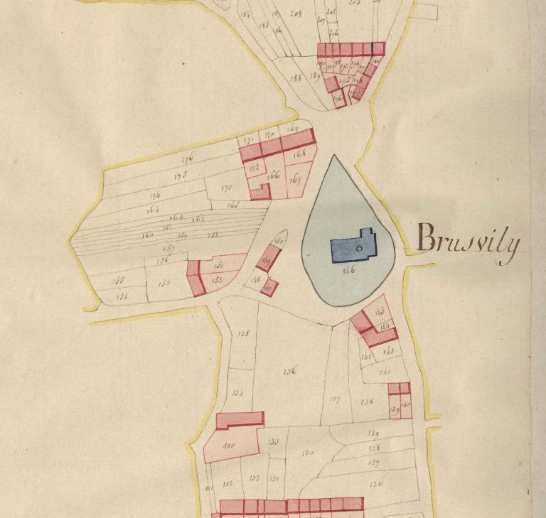 << Vers le milieu du XIIe siècle nous savons que Jean, dit de la Grille, évêque de Saint-Malo, donna aux moines de Léhon l’église Sancti Maclovii de Bluseueli, ce qui nous fournit la plus ancienne mention de cette localité. » ... « L’église, démolie en 1867, ressemblait beaucoup à toutes celles des environs, de même époque. Ici cependant une singularité : dans la longère nord se remarquait une maçonnerie, en arêtes de poisson, qui pouvait remonter au XIe siècle. Le bâtiment était rectangulaire. Un contrefort au nord et un autre au sud le soutenaient vers le bas de la nef. Cette église était basse et mesurait en longueur 29m80. Les pignons est et ouest avaient 8m de haut et 9m10 de large. Le petit clocher en bois et ardoise, situé au milieu du toit, mesurait 5m 80. Il était soutenu intérieurement par une voûte et des solives. Des restaurations avaient eu lieu à diverses époques. La date de 1700 se lisait au-dessus de la fenêtre de la sacristie. Le pignon ouest avait été refait en 1818 et la nef prolongée de 6 mètres pour permettre de recevoir les riverains de la paroisse qui venaient assister aux offices de Brusvily.