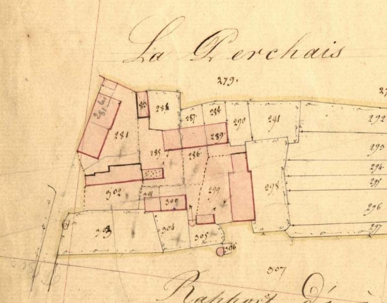 Les matrices cadastrales mentionnent également en 1843, parcelle A 243, un jardin privé appelé le courtil de la chambre. Cette précision indique un espace réservé pour un notable, propriétaire de la chambre de l’étage située dans un logis de l’ilot sud.