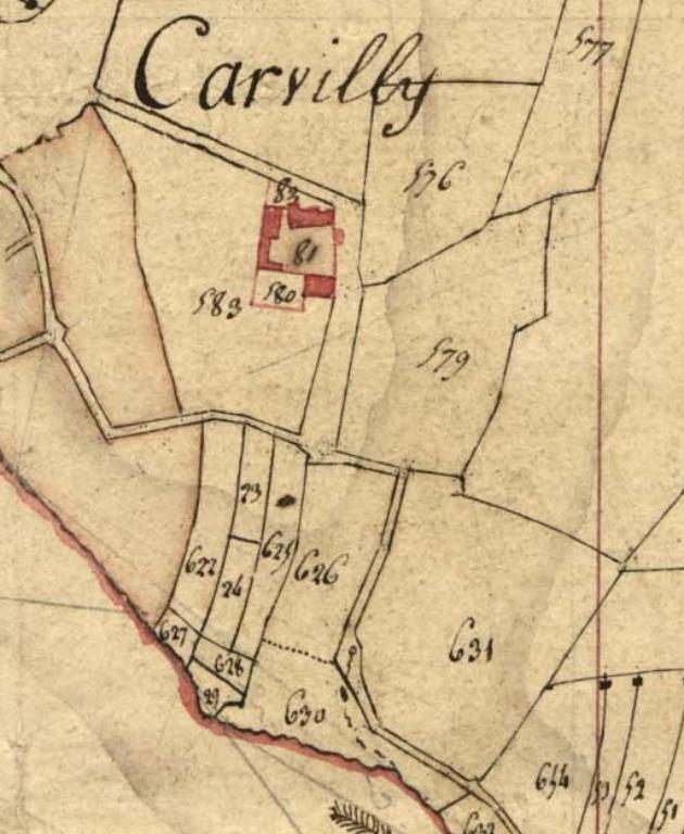 A proximité du ruisseau du même nom, la ferme actuelle de Carvilly à l’écart du hameau serait l'ancienne terre noble appartenant Josselin du Chalonge en 1448. Elle appartient en 1811 à Madame Grarry de Dinan Elle a été transformée au 19e siècle (1837 et dans la deuxième moitié du 19e siècle), mais conserve toutefois la même organisation que celle visible sur le cadastre de 1811 : l’entrée de la cour fermée par un portail, au sud-est la grange attenante à un jardin et les dépendances disposées à l’ouest de la cour. Le logis avec sa dépendance accolée est constitué de deux corps de bâtiments accolés d’inégales hauteurs qui traduisent des campagnes différentes de travaux. L’organisation en travées et les lucarnes de comble avec leurs linteaux cintrés reprennent le style simple en vigueur à cette période.