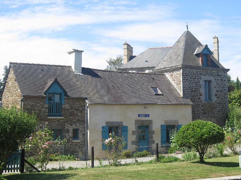 Le gros-oeuvre est du moellon de granite avec joints. La tour à l’ouest comporte trois ouvertures en façade. Une porte avec imposte au rez-de-chaussée, une fenêtre de deux vantaux et trois carreaux, encadrée par du granite à l’étage. Ces deux ouvertures ont aussi un linteau en granite. Une ouverture en gerbière avec fronton en bois et jambage en briques au dernier étage de la tour est visible. Les chaînages d’angle, sur les angles extérieurs de la tour sont aussi en granite. Les ouvertures côté sud et côté ouest de la tour sont encadrées par du granite. Une fenêtre côté ouest est aussi encadrée par du granite. Une corniche en béton est présente .