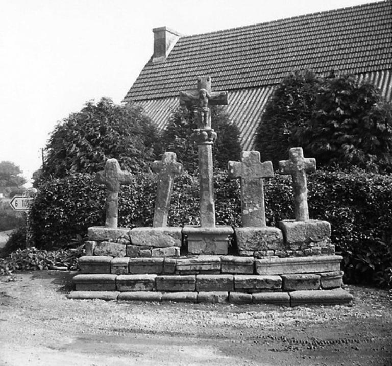 Sur le cadastre de 1826 (section B), les Cinq Croix figurent le long de la route allant de Plouaret à Lannion à vingt-cinq mètres environ de leur emplacement actuel : les croix étaient orientées vers l'est et non vers le nord. L'emmarchement primitif est toujours visible. L'ensemble a été vandalisé en 1936 puis restauré ; la croix est a été brisée lors d'un accident survenu en 1988.