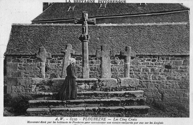 Les Cinq Croix de Ploubezre ont été illustrées par de nombreuses cartes postales. La "légende locale" veut que cet édicule ait été "élevé par les habitants de Ploubezre pour commémorer une victoire remportée par Geoffroy de Pontblanc sur les Anglais"en 1345.