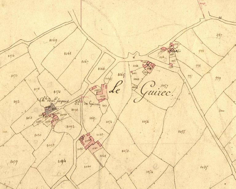 Ensemble bâti ancien, à la fois résidence et exploitation agricole, composé d'un logis de ferme et de dépendances figurant sur le cadastre de 1826 au lieu-dit Le Guirec non loin de la chapelle Saint-Jacques aujourd'hui détruite. Ce logis est orientée vers le sud-est. Il comportait vraisemblablement un logement de prêtre à l'étage auquel on accédait par un escalier extérieur. Daté par millésime de 1743, il comporte une inscription sur un linteau : "PIERE RAOUL". La maison actuelle – reconstruite dans le 4e quart du 20e siècle remploie des éléments anciens comme les linteaux en arc segmentaire caractéristiques de cette époque et une figure humaine. A l'intérieur, la cheminée du rez-de-chaussée n'a pas été modifiée : chacun des deux piédroits est orné d'une figure humain.