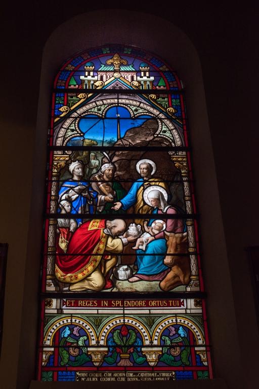 La maîtresse-verrière ne se situe pas sur le chevet. Elle est installée sur la façade nord et éclaire l'autel latéralement. Cette disposition est sûrement liée au baldaquin (classé) disposé au-dessus de l'autel. En vis-à-vis, une autre ouverture en plein-cintre permettait aux religieux de suivre la messe en même temps que les laïcs, sans communication entre eux.