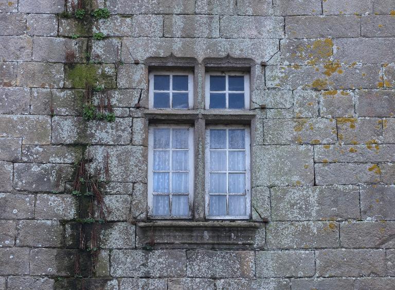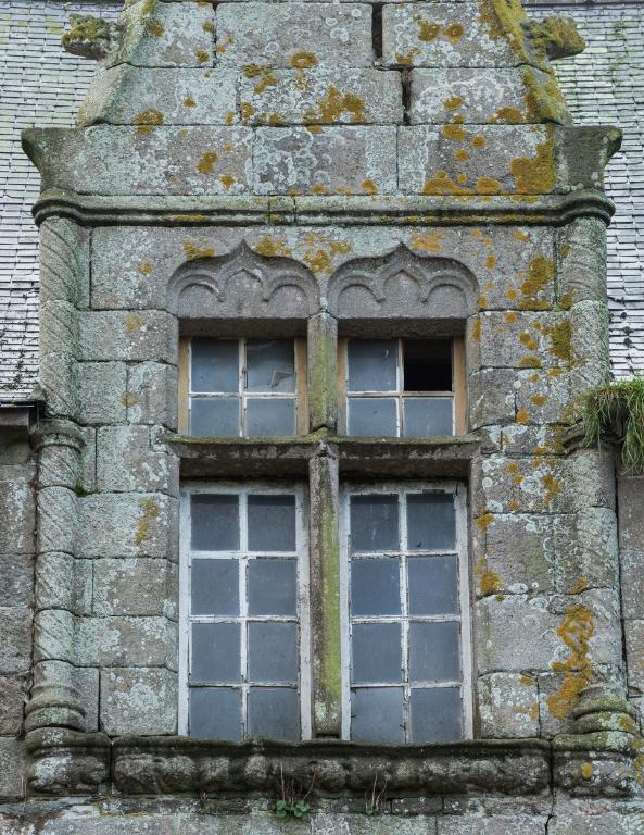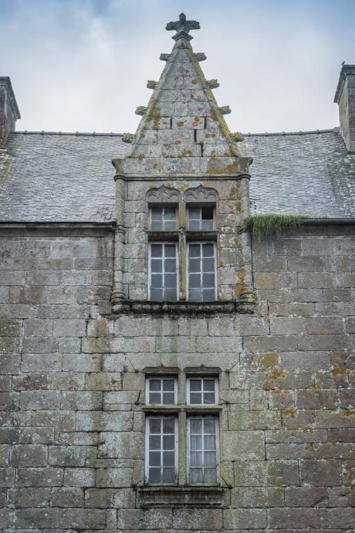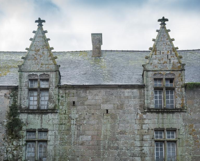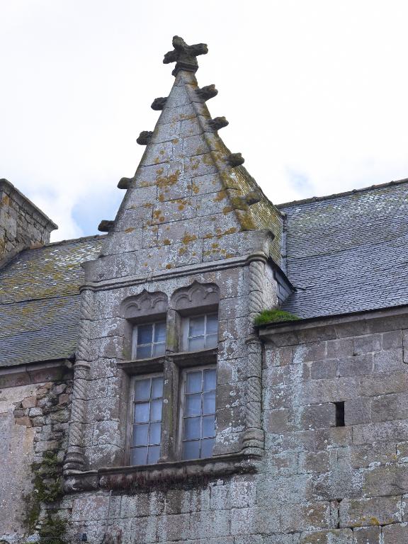 Les deux lucarnes du logis développent un répertoire gothique flamboyant : baies trilobées à meneaux avec linteaux à double accolade, colonnettes tores, choux frisés et fleurons. Les appuis saillants sont sculptés d'une frise représentant un lièvre et un chien mangeant des pommes de pin. Certains détails comme les crossettes des lucarnes – dont la forme perdure jusqu'au 19e siècle - semblent pourtant montrer une simplification relative du chantier. Ce grand logis est vraisemblablement datable des années 1500-1510, il se distingue par sa distribution particulière (corridor central) et la puissance qui se dégage des lucarnes ornées.