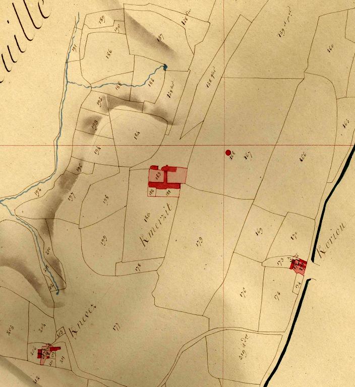 Voici la description de l'autre moitié du manoir : "la maison d'en haut au midi de la cour avec chambre et grenier au-dessus telle qu'elle est actuellement occupée par les preneurs, écurie pavée ayant porte sur la cour, la loge à piler de l'ajonc, la crèche à vache au nord de la cour d'en haut ; une soue à porcs contre l'écurie, petite crèche sous la tourelle avec une auge en pierre, le tout d'une contenance de 7 ares 44 centiares".