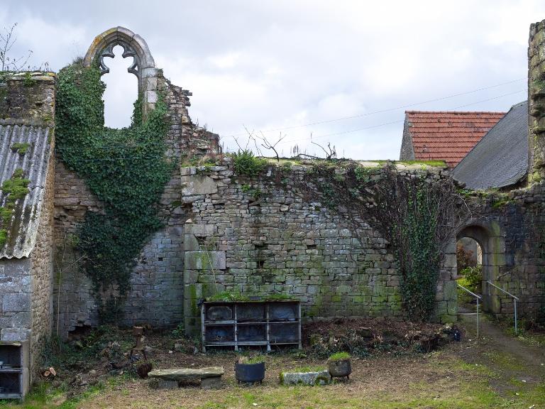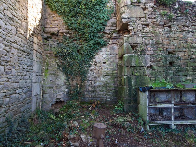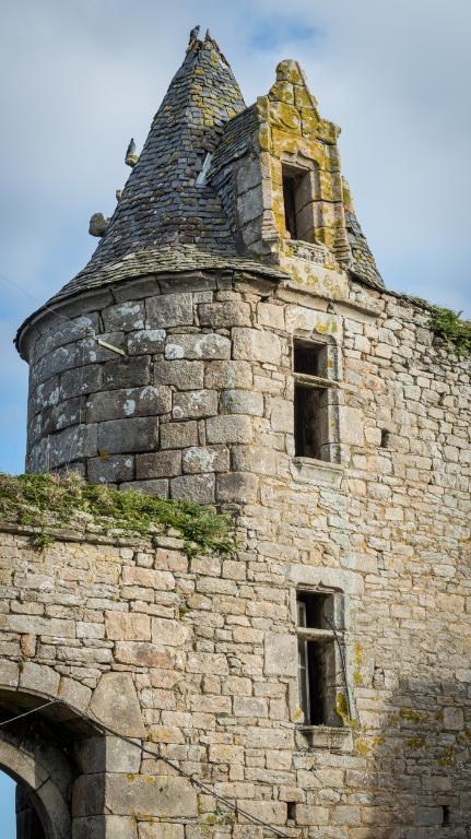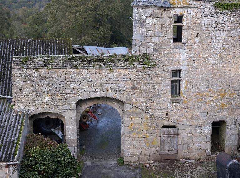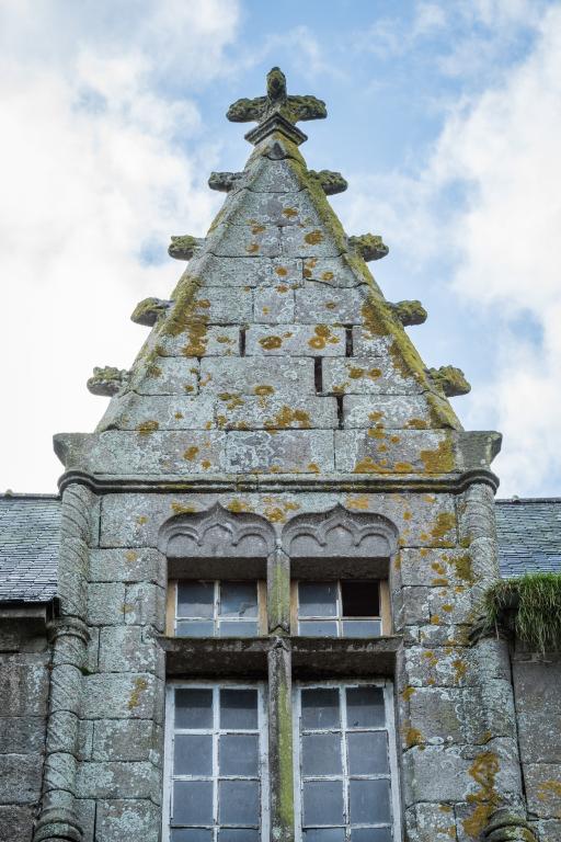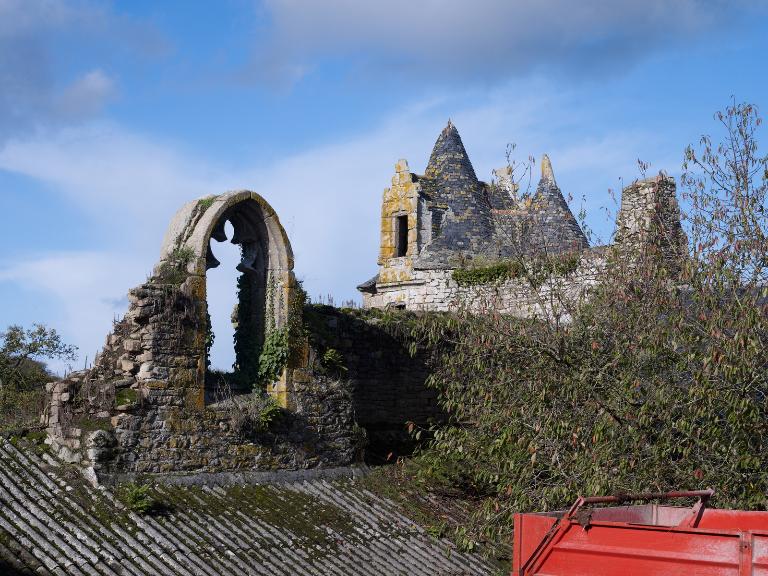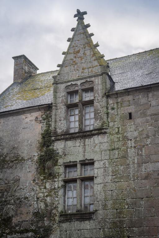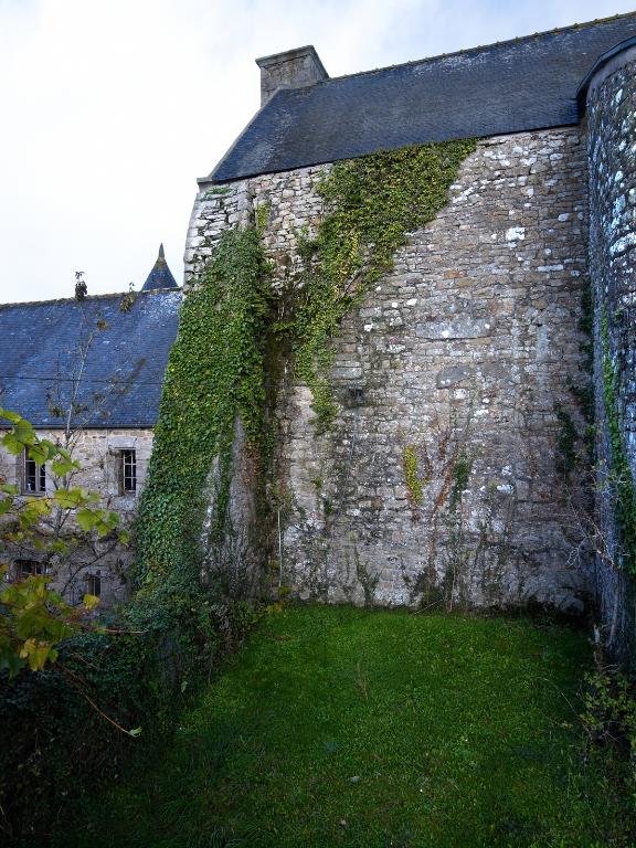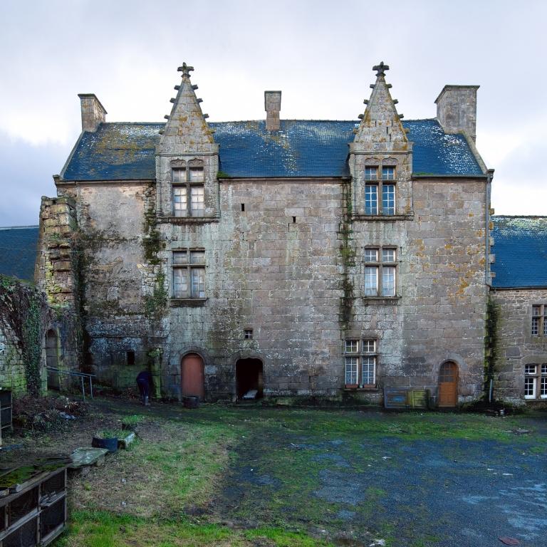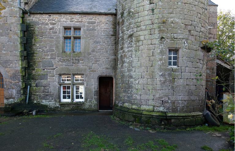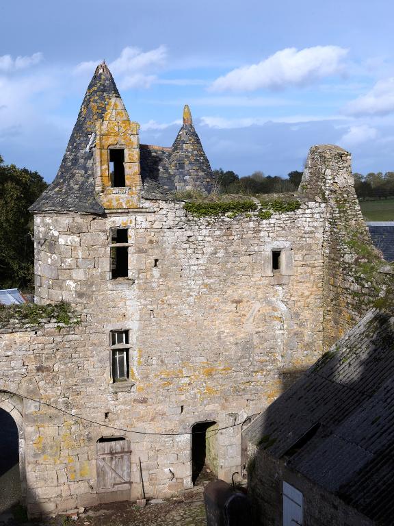 À l'ouest se dresse le logis primitif avec tour d'escalier en élévation antérieure. La façade nord est percée d'une porte tout comme la tour est percée à l'ouest d'une porte basse (aujourd'hui murée). Cette dernière est ornée d'un linteau à accolade. L'extrémité ouest du logis - figurant sur le cadastre de 1848 - a été détruite. Si la façade sud, à l'origine aveugle, a été percée par de multiples ouvertures dans la deuxième moitié du 20e siècle, la façade nord semble avoir été remontée à une date indéterminée (mais peut-être ancienne). L'analyse stylistique - linteau à accolade et arc de décharge en pierre debout – et la mise en œuvre soignée en pierre de taille de granite permettent de dater la tour de la fin du 15e siècle (1490-1500). La fenêtre de l'étage du logis semble plus ancienne que celle du rez-de-chaussée : il pourrait s'agir, à l'origine, d'un logis long ressemblant à celui du Launay à Ploubezre.