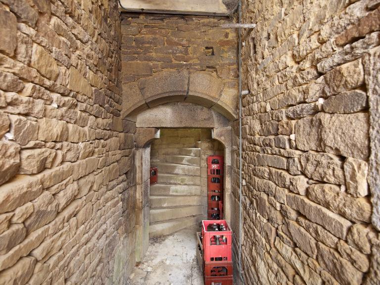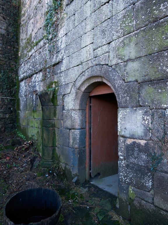 Les deux pièces du rez-de-chaussée disposent chacune d'une porte débouchant au sud (le pied de l'élévation sud a été comblé sur une hauteur d'environ 1,5 m). Une porte relie la pièce ouest à usage de cuisine, à la tour d'escalier.