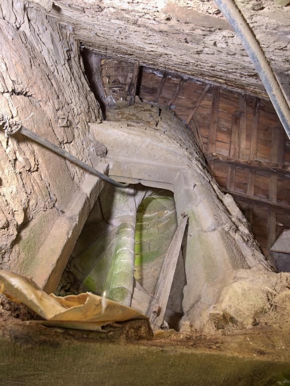 Au niveau des combles (peut-être prévus pour être habitables dans le projet initial), le palier comporte trois portes qui donnent, d'une part sur deux greniers séparés par un mur de refend et, d'autre part sur un petit escalier en vis secondaire donnant accès à une pièce haute. La partie supérieure de la tour a été arasée au 20e siècle : la pièce haute n'existe plus tout comme la partie sommitale de l'escalier en vis secondaire. Des désordres importants affectent la tour.