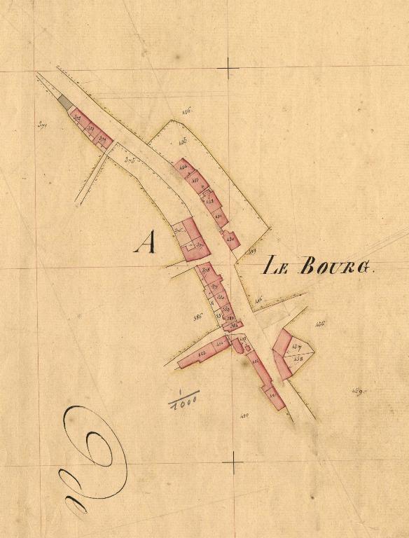 - de manière lâche autour de l’église et de son cimetière : 5 ensembles bâtis - des fermes - dont les logis sont orientés grossièrement vers le sud. A l'est immédiat de l'église, en contrebas, une fontaine alimente un bassin dont le trop-plein se déverse dans un petit ruisseau filant vers l'est-nord-est. Aucune croix ne marque cette petite agglomération.