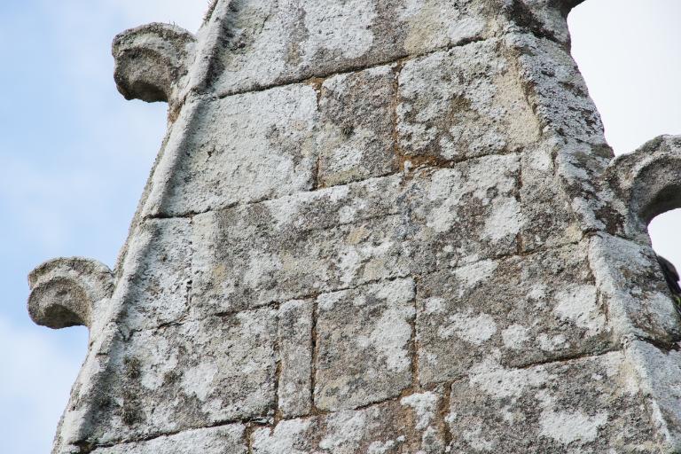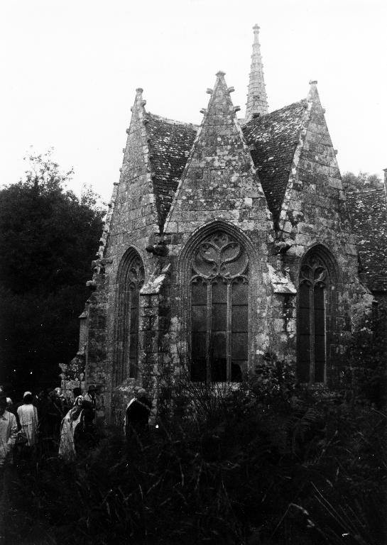 - à l'est, une abside polygonale (ou chevet à noues multiples) dont chaque pan est couronné d'un pignon élancé (fronton triangulaire ou gâble) ouvragé. Rompant avec le modèle du chevet plat, cette solution permet d'accentuer verticalement le sanctuaire tout en faisant rentrer plus de lumière dans le chœur. On peut citer les exemples plus tardifs d'absides polygonales de Langonnet (église tréviale de La Trinité) ou de Pleyben (Saint-Germain).
