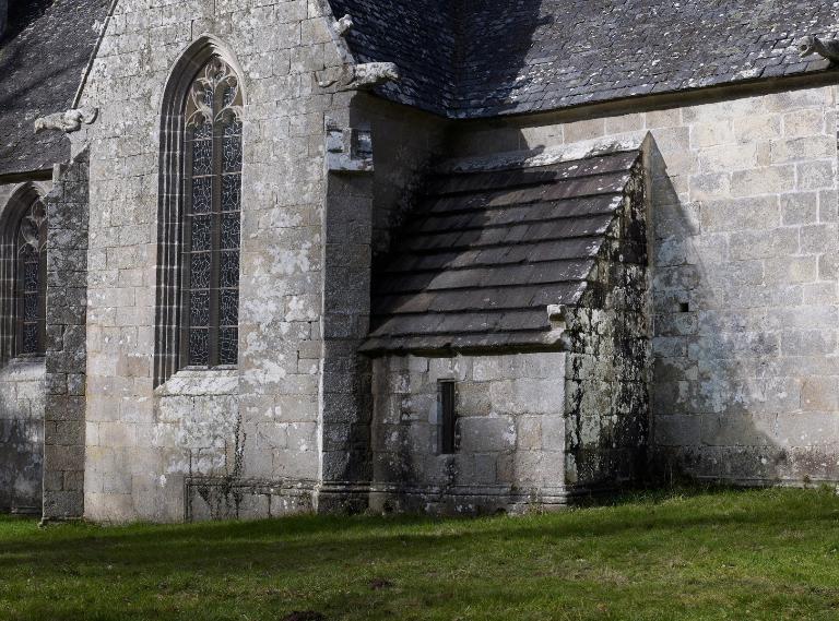 La sacristie - en appentis sur la nef et le transept sud - a été construite postérieurement. Voûtée en arc plein cintre et couverte en pierre de taille de granite, percée d'un unique petit jour vertical, c'était une véritable "chambre forte" pour les pièces d'orfèvrerie qui contenaient des reliques. Les pignons de l'abside portent des armoiries : les seigneurs du Plessis-Éon possédaient en effet des droits de prééminences. La chapelle porte également les armes de la famille Le Long de Keranroux. Elle fut acquise par Louis Clech le 2 juillet 1838 de la famille de Calan.