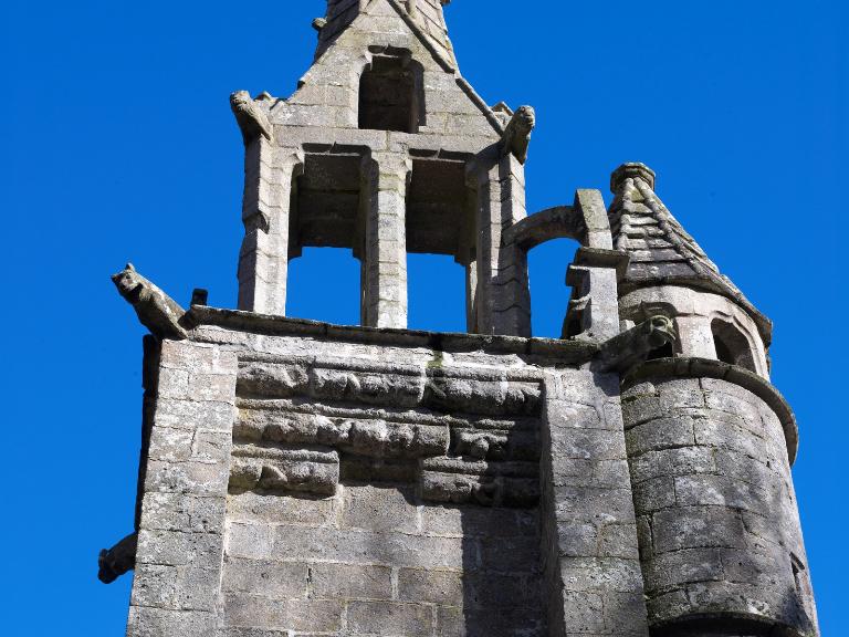- à l'ouest, un haut clocher-mur à contreforts surmonté d'une plate-forme bordée d'une balustrade (disparue) ; trois chambres de cloche (sur deux niveaux) surmontées d'une haute flèche octogonale. La tour est flanquée au sud d'une tourelle d'escalier hors-œuvre qui monte jusqu'au niveau de la plate-forme : elle se termine par un lanternon coiffé d'un toit en pyramide hexagonale.