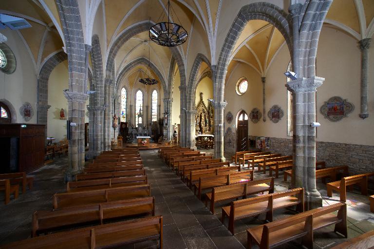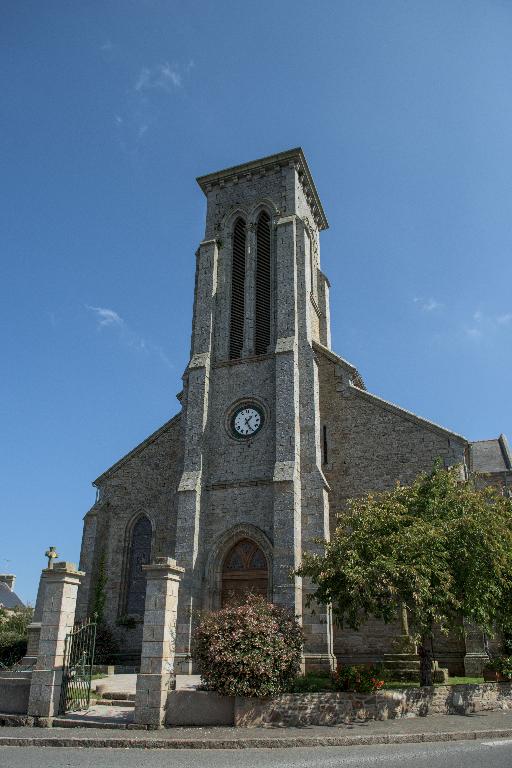 Les matériaux de construction de l'église sont les mêmes que ceux utilisés dans l'habitat. Le clocher, le tour des baies et les contreforts sont bâtis en pierre de taille de granite gris, tandis que le reste de la maçonnerie est réalisé en moellon de granite et de schiste jointoyés à la chaux hydraulique. Les collatéraux et le vaisseau central sont couverts d'ardoise. Les pierres de taille des contreforts et des fenêtres, formant un léger ressaut, laissent supposer que l'édifice était destiné à être enduit à la chaux.