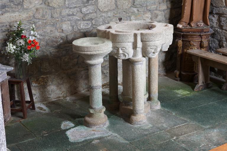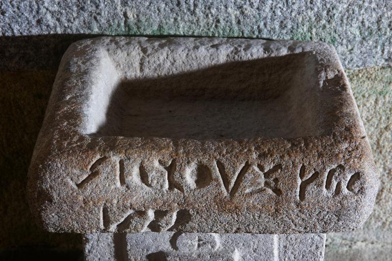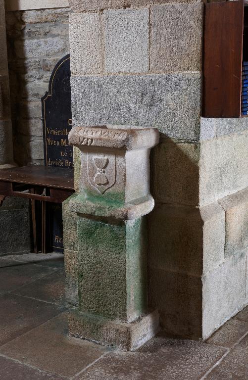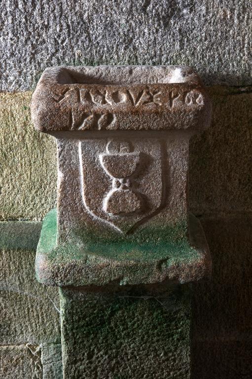 Une autre bénitier est placé dans l'église, au niveau de la porte principale à l'ouest. Reposant sur un piédestal, il porte un blason sculpté d'un calice en relief. Sur son rebord, il porte la date de 1589 et plusieurs inscriptions.