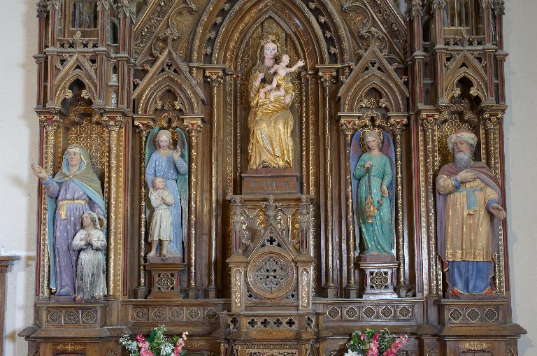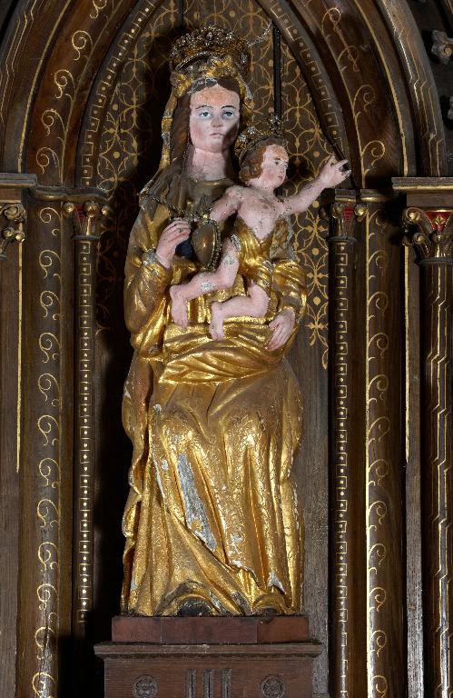 Plusieurs statues anciennes en bois sont aussi réutilisées dans l'église actuelle : deux anges du 18e siècle au pied du maitre-autel dans le chœur, un grand crucifix de la fin du 16e ou du début du 17e siècle, près de l'autel du transept sud et une statue de Notre-Dame de Grâce, placée sur le retable du même autel. Cette dernière, probablement du 17e siècle, porte l'enfant Jésus dans ses bras, alors que celui-ci ce détourne d'elle, le bras tendu vers le fidèle. Il devait probablement tenir un chapelet dans sa main.